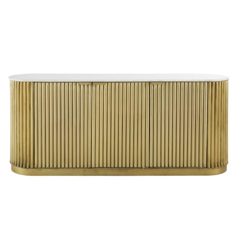Brass-Coloured Corrugated Metal And White Marble 3-Door Sideboard Louxor | Maisons Du Monde